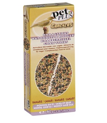 Bâtonnet à ronger pour canari. 2 pièces. Miel et oeuf. Ingrédients : Graines d'alpiste, blé, chips de blé extrudé, graines de colza, oeuf desséché, par atomisation, miel, millet rouge, millet jaune, chènevis, graines de niger, graines de pavot bleu, sucre, calcium.