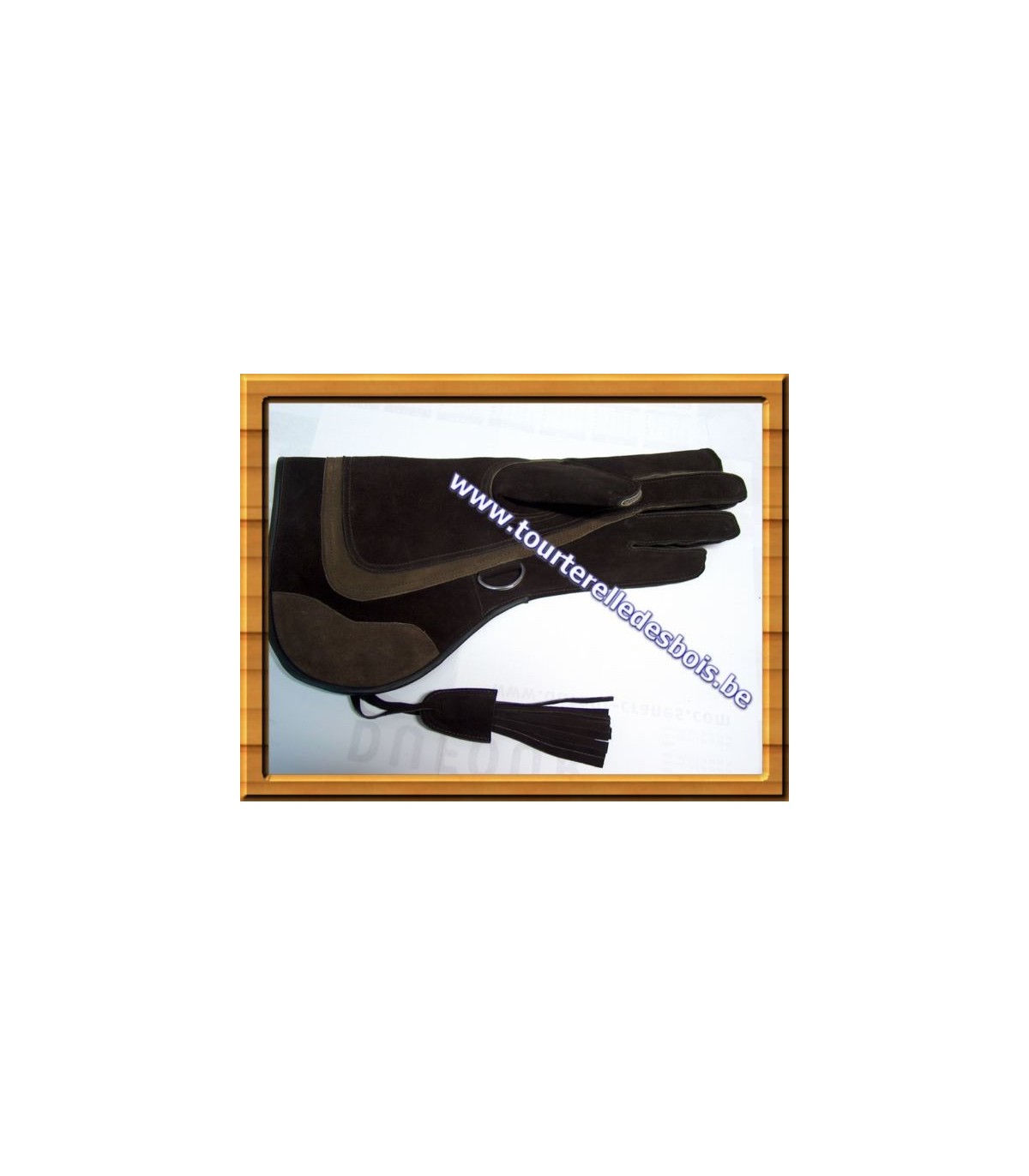 Gant de fauconnerie en cuir suédé de couleur brun.